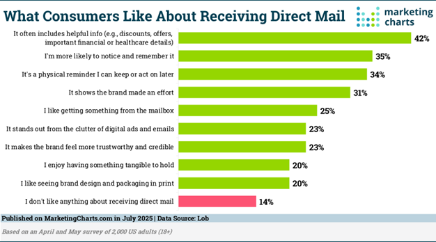 According to a study by LOB, direct mail continues to hold strong appeal across generations. In fact, consumers rank it as one of the most trustworthy and engaging forms of marketing. That’s a massive deal in an age where digital fatigue is real and attention spans are short.